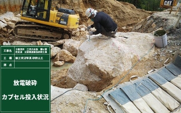 「二級河川二河川水系鎌ヶ原川左支渓災害関連緊急砂防工事」において、環境リスク低減実施のため、「放電破砕工法」を採用しました。砂防本堰堤中央部の大型ブレーカーを用いての掘削に比べ、新技術の併用使用により、大型ブレーカー使用日数を削減。騒音リスクの低減を実現できました。