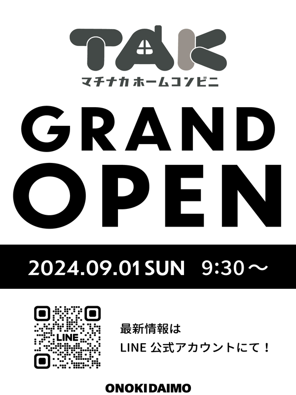 長らくお待たせしておりました、ホームセンターTAKは、新たに、マチナカホームコンビニTAKとして9月1日(日)9:30~