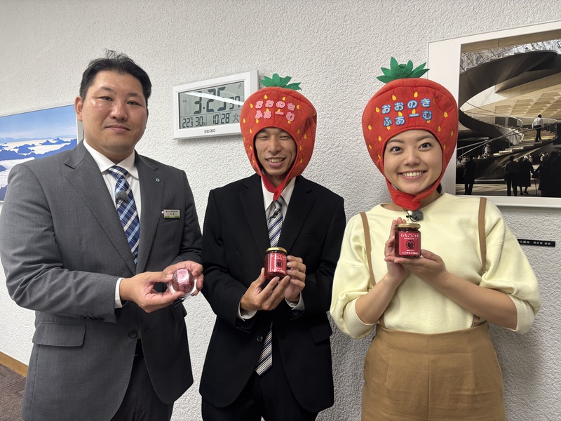 大之木ファームも一緒に取材していただきました!!苺帽子お二人ともよく似合っています!!