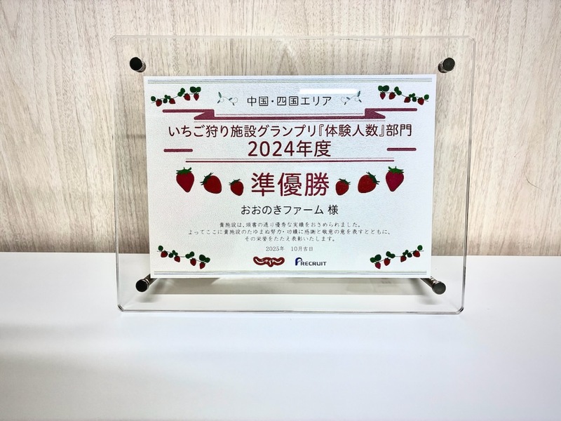 大之木ファーム………いちご狩り施設グランプリ『体験人数』部門2024年度準優勝を受賞しました~~~!ヾ(≧▽≦*)o