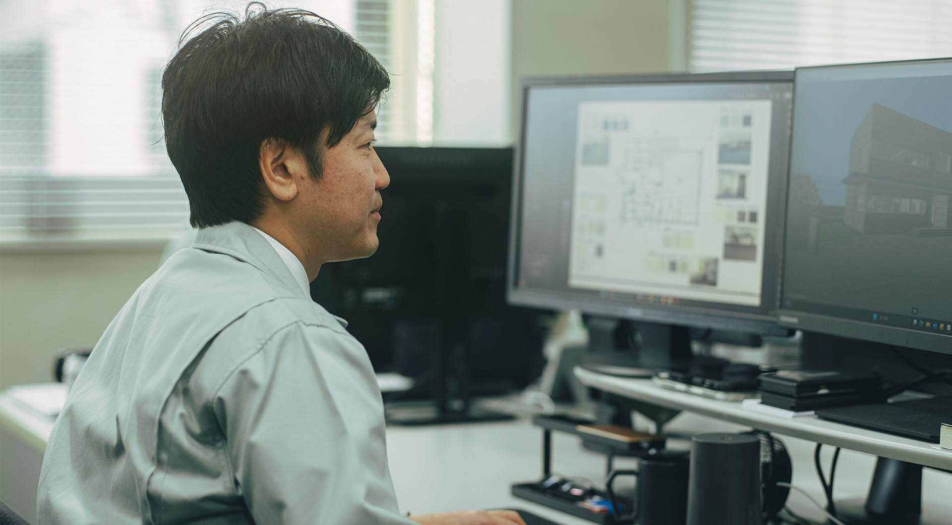 入社した頃は図面を描いて仕上げることに集中していましたが、最近は少し余裕が生まれ、作成した図面を見返すことが増えてきました。本当にお客様にとって最適なプランなのか、デザイン面も踏まえて考える時間が増えたと思います。基本的には工事が始まる前までに考えるのですが、図面の決定後であっても、本当にこうしたいという強い思いのもと、現場主任や上司にも相談のうえ、プランを変更したこともあります。もちろん、お金にも関わってくるので、お客様も含め皆さんの納得が得られることが前提にはなりますが、最後までこだわり、より良いものをつくりたいという思いが強い大之木建設だからこそできることです。そうして関わった一つひとつの仕事を次に生かすことで、設計部の中でも「この図面は日浦のだな」という個性がわかるような設計をしたいと思っています。